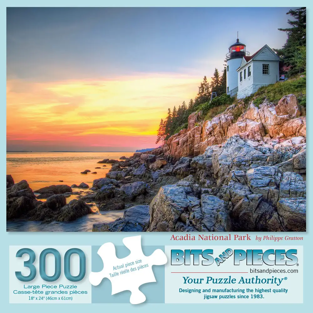 Experience the rugged beauty of the Maine coastline with our *Acadia National Park* puzzle, featuring stunning photography by Philippe Gratton. This captivating scene showcases the iconic lighthouse perched atop rocky cliffs, bathed in the warm glow of a sunset over the Atlantic Ocean. Available in 500 and 1000 pieces, this puzzle offers a serene and challenging escape, perfect for anyone who loves the tranquility of coastal landscapes. Bring the natural beauty of Acadia National Park into your home with this breathtaking puzzle.