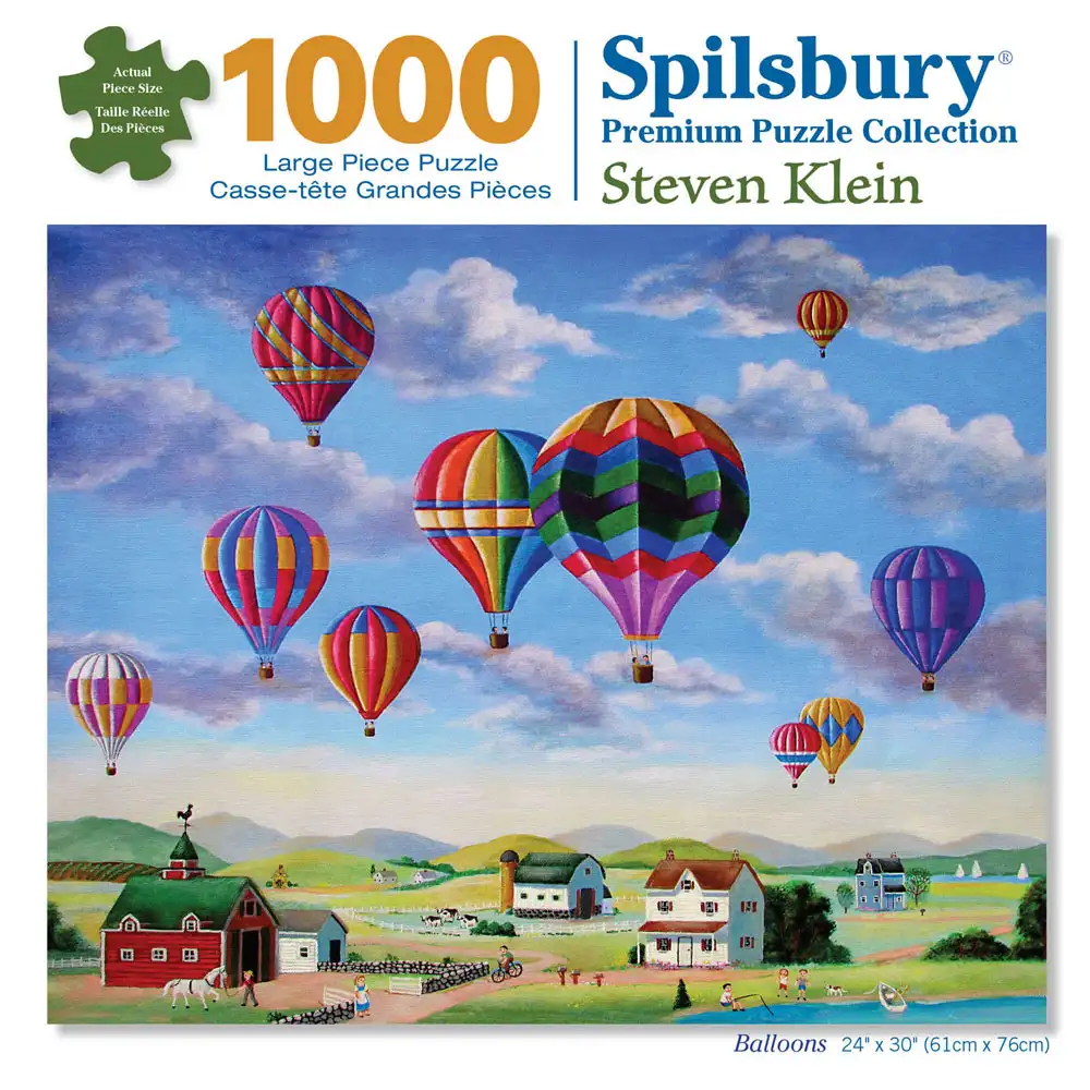 Soar through the sky with this whimsical 1,000-piece jigsaw puzzle by artist Steven Klein. A cheerful scene unfolds as colorful hot air balloons drift over a peaceful countryside dotted with red barns, cozy homes, and rolling hills. Kleinâs folk art style brings warmth and charm to every detail, from the grazing horses to the children playing below. Perfect for puzzle enthusiasts who love Americana, country living, and bright, uplifting artwork.
