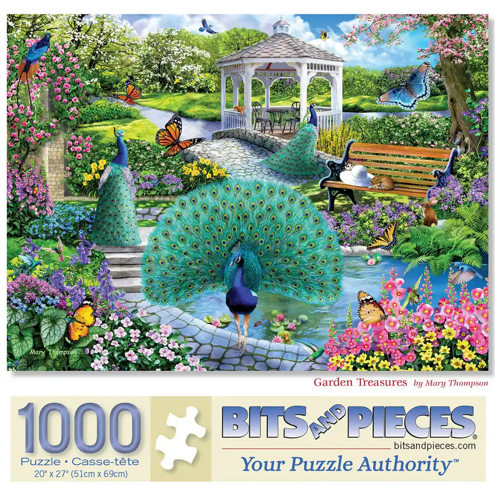 Stroll through a serene paradise with Garden Treasures by Mary Thompson. This enchanting scene features regal peacocks proudly displaying their vibrant feathers amidst a lush garden bursting with colorful flowers. Butterflies flit gracefully, a charming gazebo invites relaxation, and even a cozy bench holds hidden treasures. Every detail adds a touch of magic to this picturesque retreat.