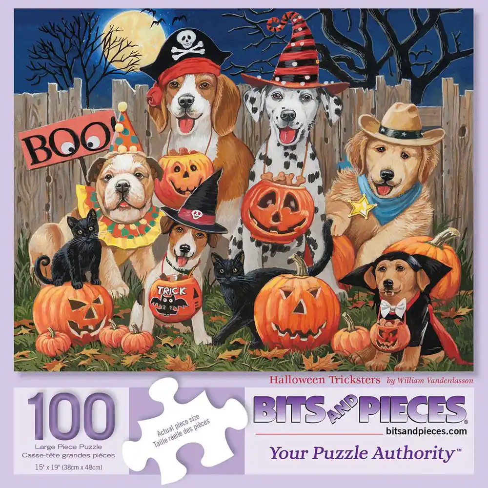 This jigsaw is designed by William Vanderdasson and available in multiple piece count. The Halloween puppies are ready for trick or treating in all of their silly costumes.