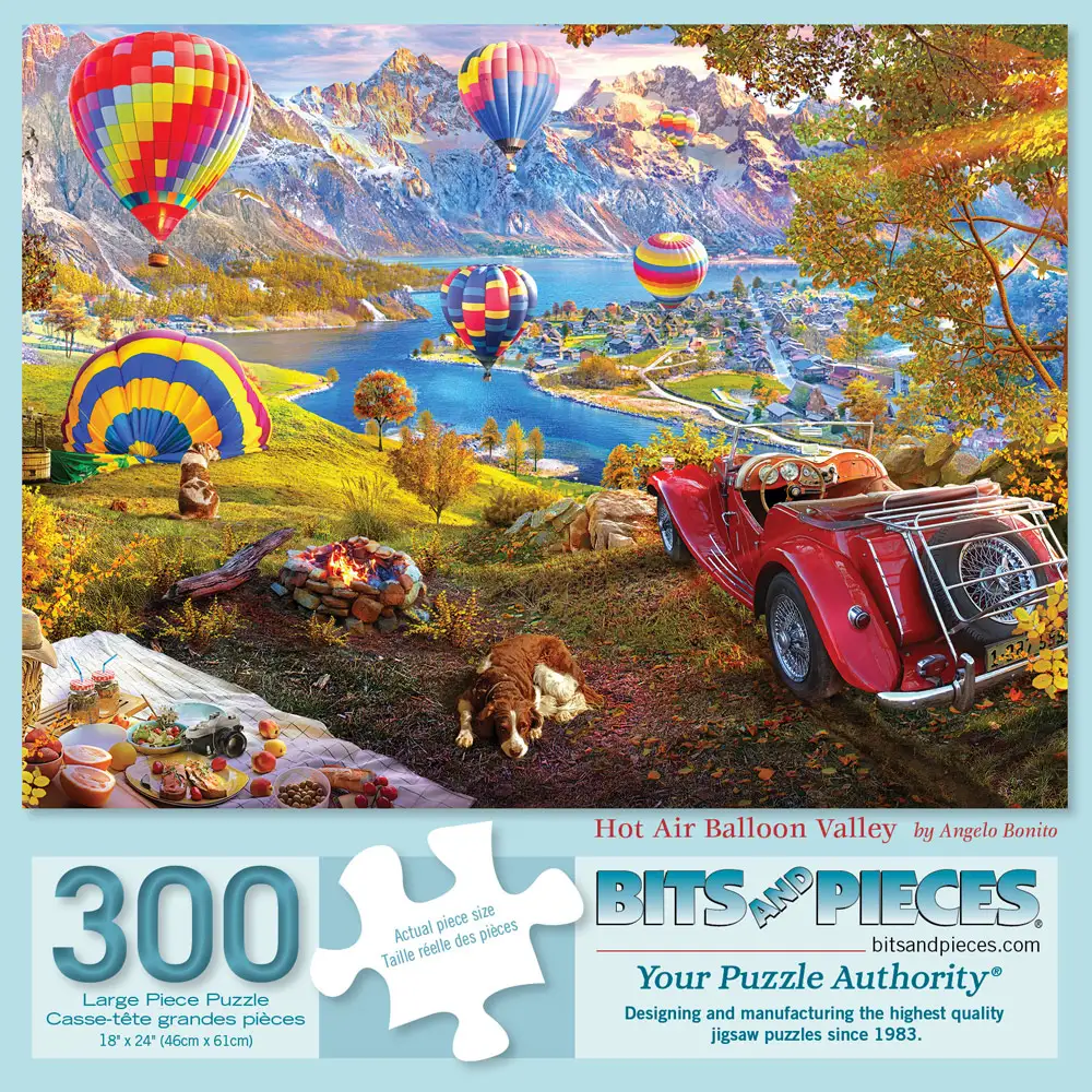 Step into a world of wonder with Hot Air Balloon Valley by Angelo Bonito. This breathtaking puzzle invites you to soar above a peaceful valley, where vivid hot air balloons glide gracefully against a backdrop of towering mountains and a glistening lake. The scene bursts with warmth and charm—autumn leaves ablaze, a vintage red car parked near a campfire, and a loyal pup resting nearby. Every detail tells a story of serenity and adventure. Let this captivating scene transport you to a world of tranquility and beauty! Bring this serene adventure to life, one puzzle piece at a time!