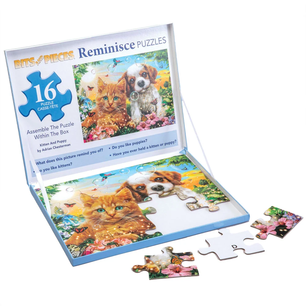 Bring home the charm of furry friendship with the Kitten and Puppy Reminisce Puzzle by Adrian Chesterman! This delightful puzzle features an adorable kitten and puppy surrounded by colorful butterflies and glowing bubbles, making it a joy to assemble. Designed with extra-large pieces for easy handling, it's perfect for kids, seniors, and puzzle lovers of all ages. Available in 16 or 35 pieces, it includes a slim box tray, a reference image, and fun questions for an interactive experience. Stay connected with family and friends with our Reminisce Puzzles collection. Not only are puzzles good for young, developing brains, but they can also benefit older individuals with memory loss. Each Reminisce Puzzle comes in an easy open slim box tray for puzzle assembly. Youâll find a reference image along with four engaging questions printed inside the box and an insert with tips for a pleasant puzzle experience. Each puzzle is available in 16 and 35 extra large pieces and measures 10" x 13". Includes letter codes on back to sort pieces by section. This jigsaw puzzle is designed by Adrian Chesterman.