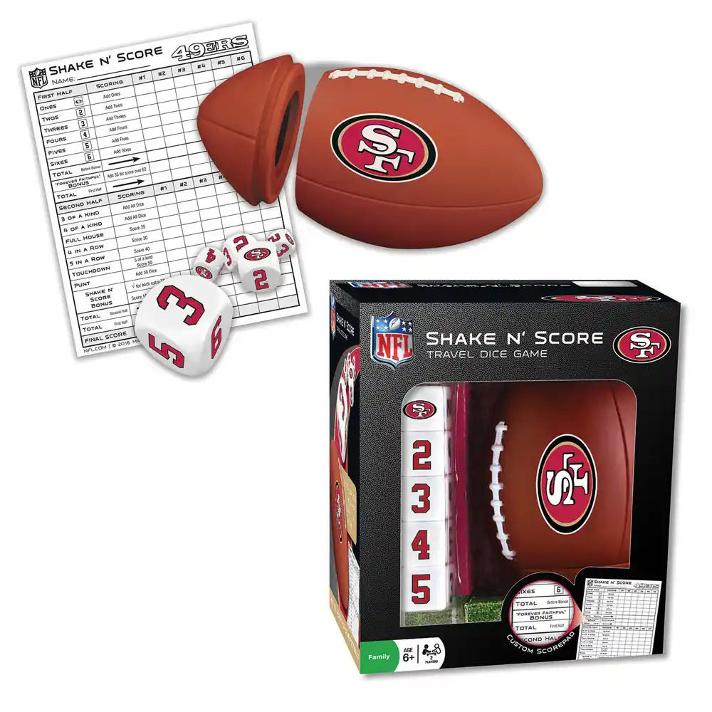 A collectible travel dice game for football fanatics! Hike up your points to win by rolling different combinations of the five dice. It's a bit like Yahtzee, but football-themed! Choose your favorite team for branded dice shaker and scorecards. Available in Dallas Cowboys, San Francisco 49ers, and Pittsburgh Steelers varieties. Game includes branded football dice cup, five dice and score pad. Ages 6 and up.