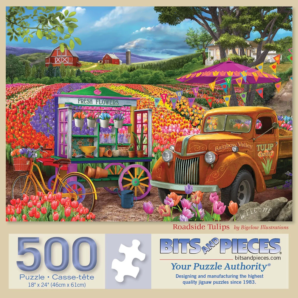 This lively jigsaw puzzle by Bigelow Illustrations overflows with color. A flower truck and roadside stand offer tulips by the bundle against a backdrop of fields, mountains, and a cheerful blue sky. It's a celebration of spring in full bloom.