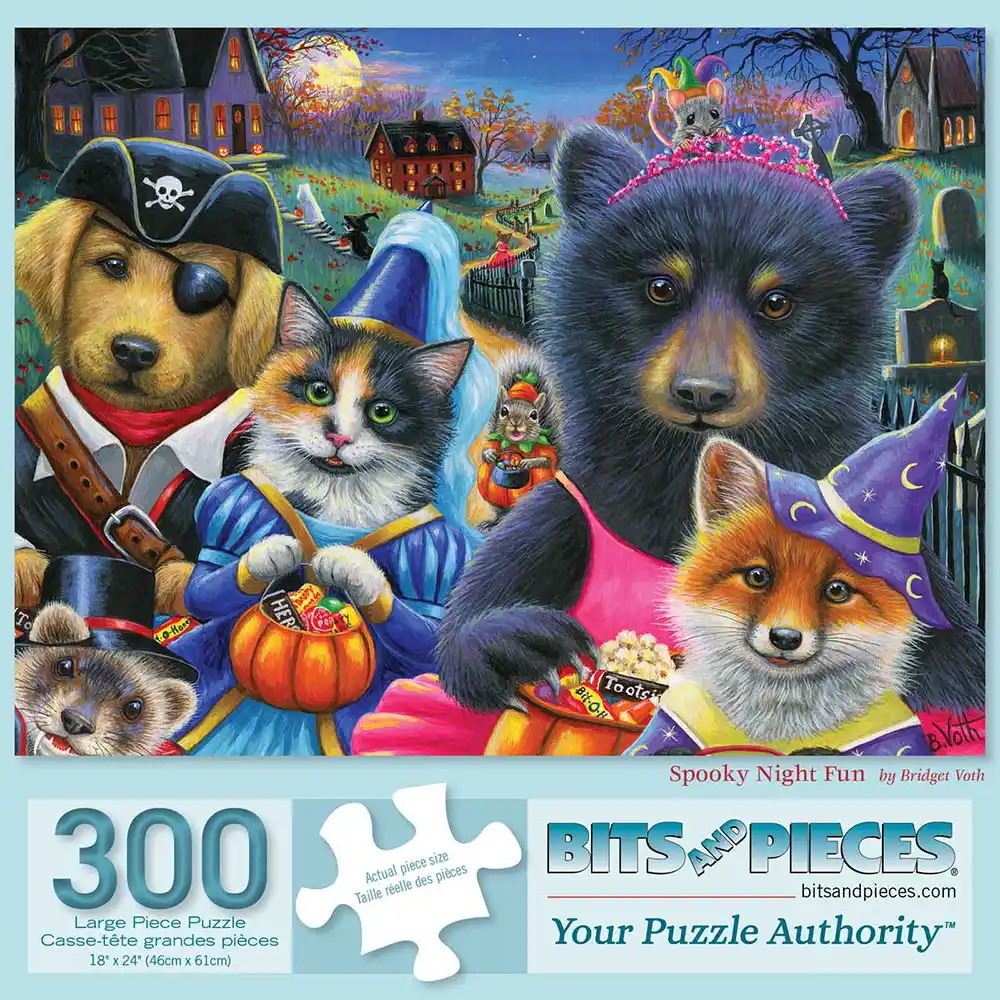 Get into the Halloween spirit with this whimsical jigsaw puzzle, "Spooky Night Fun," designed by Bridget Voth. This playful artwork showcases adorable animals dressed in costumes, from a pirate dog to a princess bear and witchy fox, all ready for trick-or-treating. The vibrant details and charming characters make this puzzle a delightful challenge for all ages. Perfect for adding a touch of festive fun to your family gatherings or gifting to puzzle enthusiasts. Enjoy a spooky yet adorable scene as you piece together this captivating Halloween-themed puzzle.