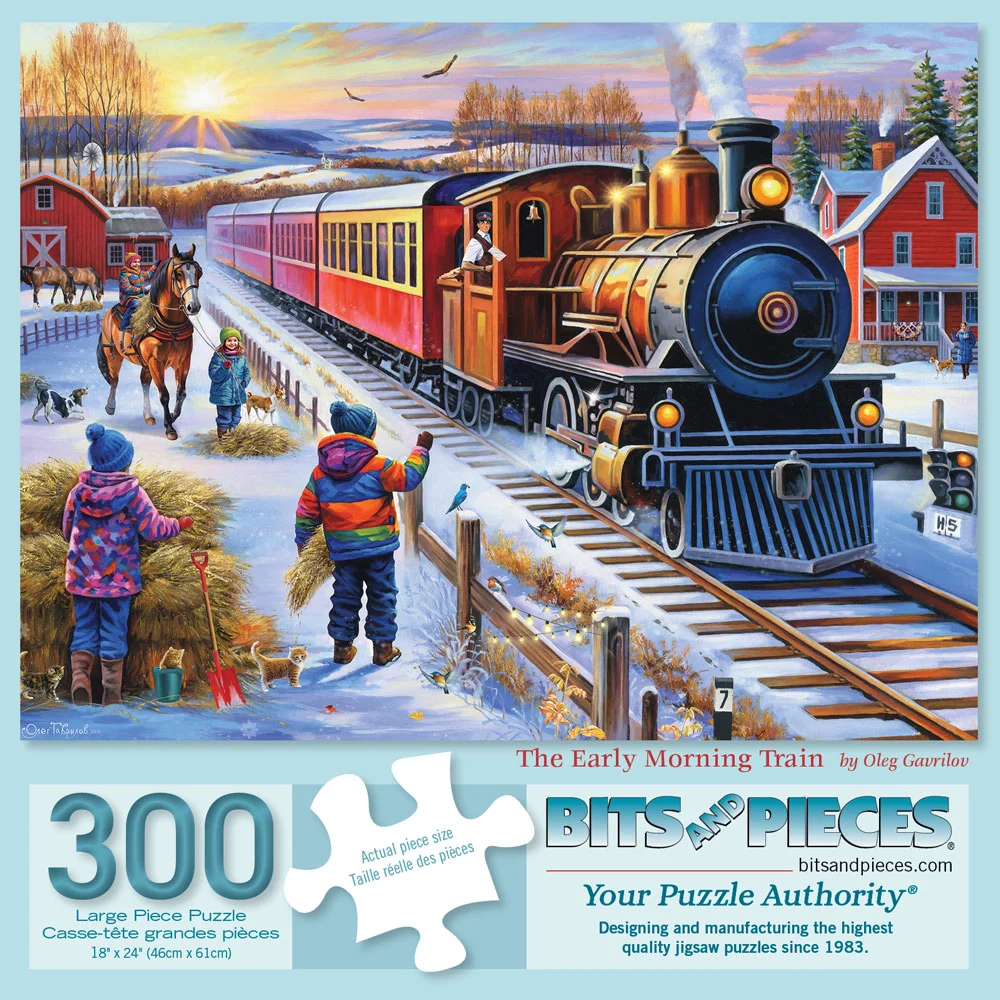 Steam billows, boots crunch on snow, and families wave goodbye in this bustling winter train station jigsaw puzzle. Oleg Gavrilovâs scene is filled with small-town warmth and the quiet excitement of early morning travel. Itâs a picture-perfect snapshot of rural life on a winterâs day.