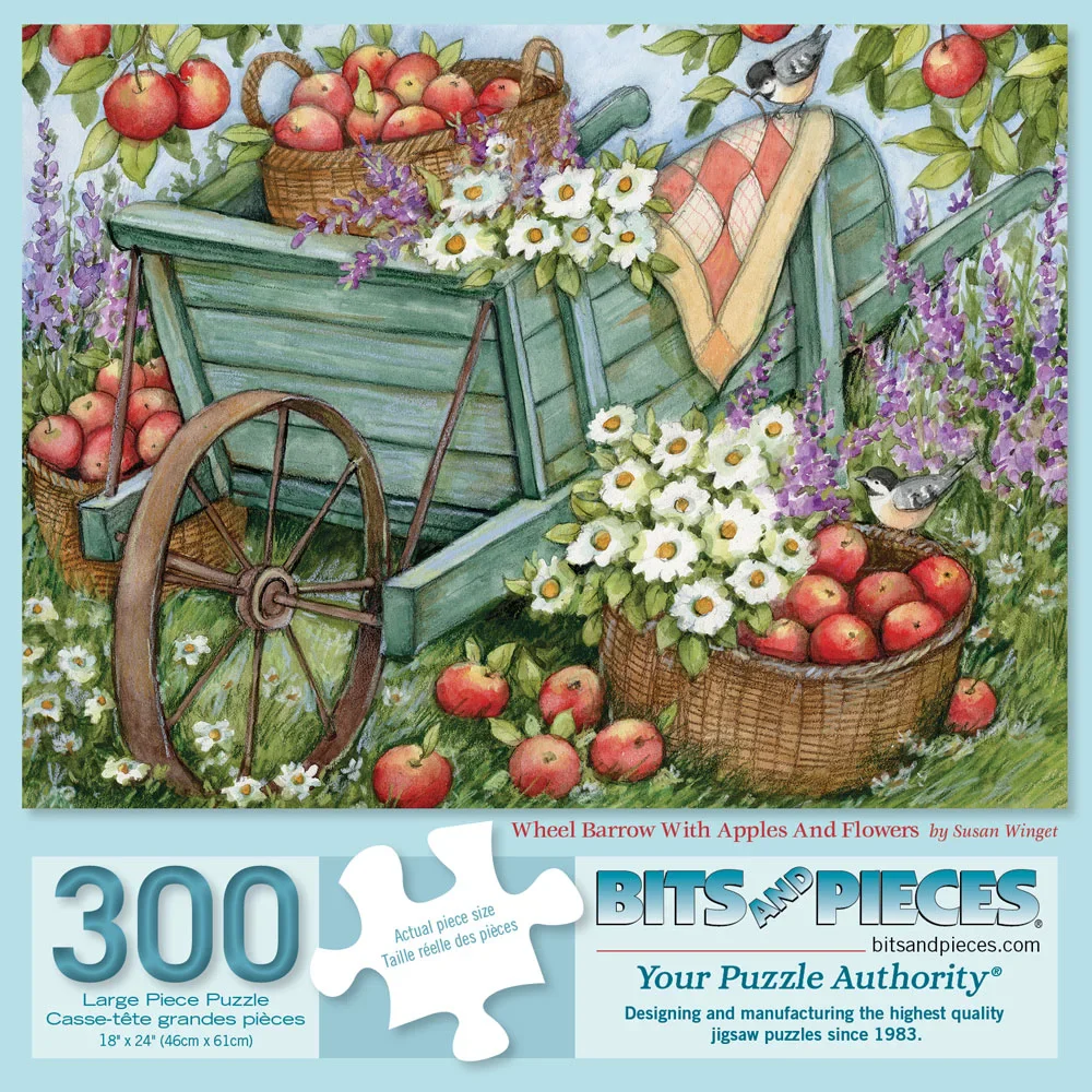 Tucked between blooms and orchard trees, Wheelbarrow with Apples and Flowers is a sweet celebration of harvest and home. Susan Wingetâs signature watercolor style fills this peaceful scene with baskets of bright red apples, cheerful daisies, and friendly birds perched among the petals. Itâs a gentle reminder of lifeâs simple pleasuresâand a cozy puzzle perfect for any season.