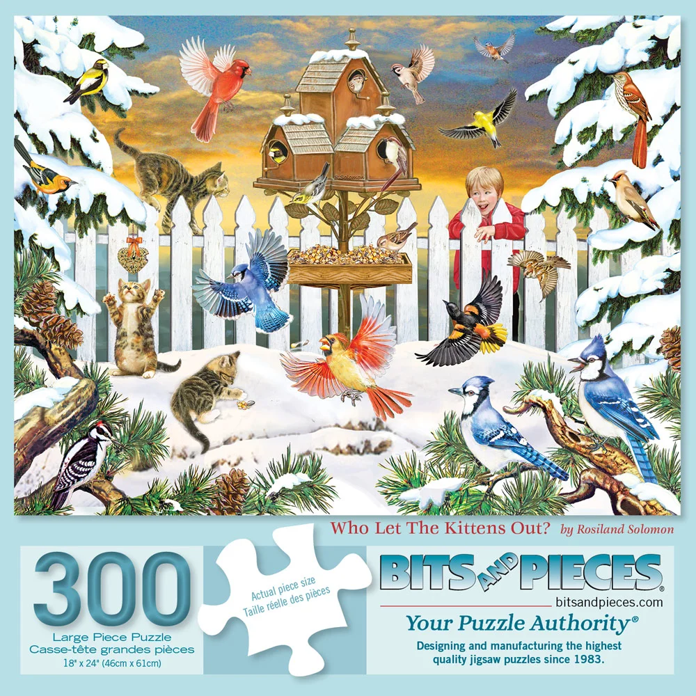 The birds are confused and the fence is full in Who Let the Kittens Out by Rosiland Soloman. Kittens tumble into a snowy backyard bird haven, causing adorable mayhem. This whimsical winter puzzle is packed with playful cats, curious birds, and one surprised child watching the chaos unfold.