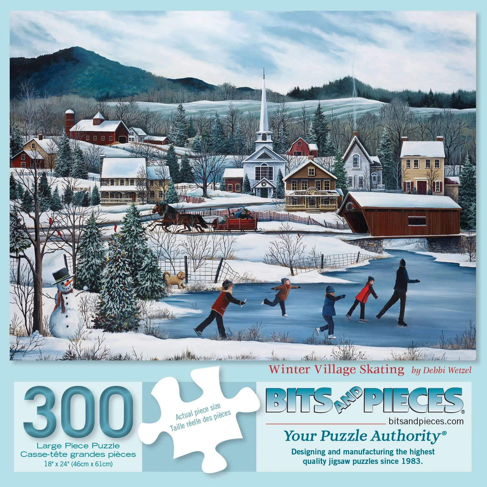 Lace up your skates and glide into a snowy village scene in this charming winter jigsaw puzzle by Debbie Wetzel. Children skate across a frozen pond while snow blankets the rooftops and smoke curls from cozy chimneys. A peaceful and nostalgic nod to classic small-town winters.
